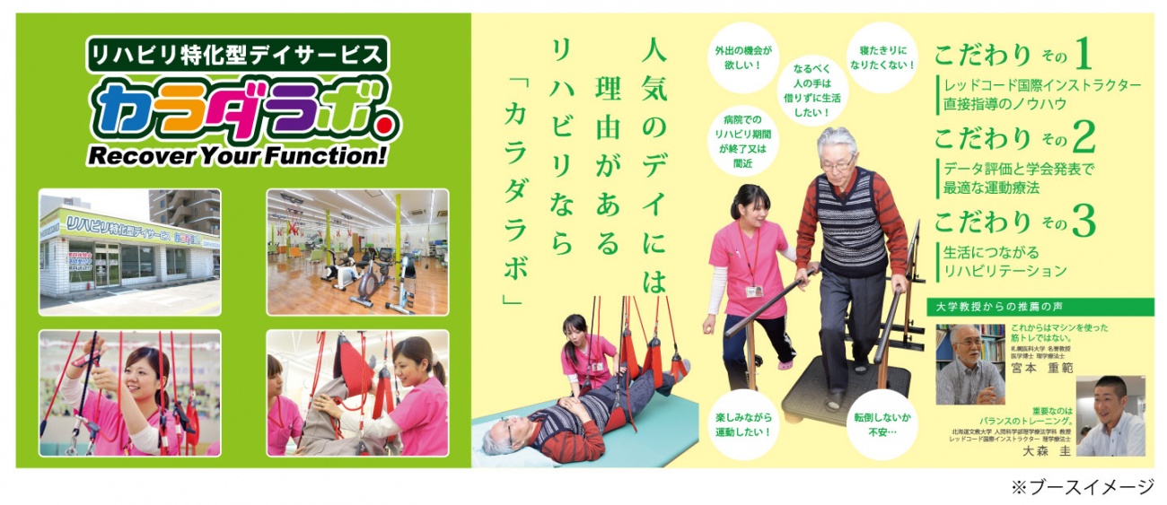 「リハビリ特化型デイサービス カラダラボ」は、2025年の介護熟成社会の構築に向けて、リハビリ施設の全国インフラ網をつくるべく、ご賛同いただけます企業様全社参加型の会員組織でございます。2015年の介護保険制度改正を目前に控え、今が介護事業参入のラストチャンス!是非、株式会社ヒューマンリンク「リハビリ特化型デイサービス カラダラボ」のブースにお立ち寄りください。