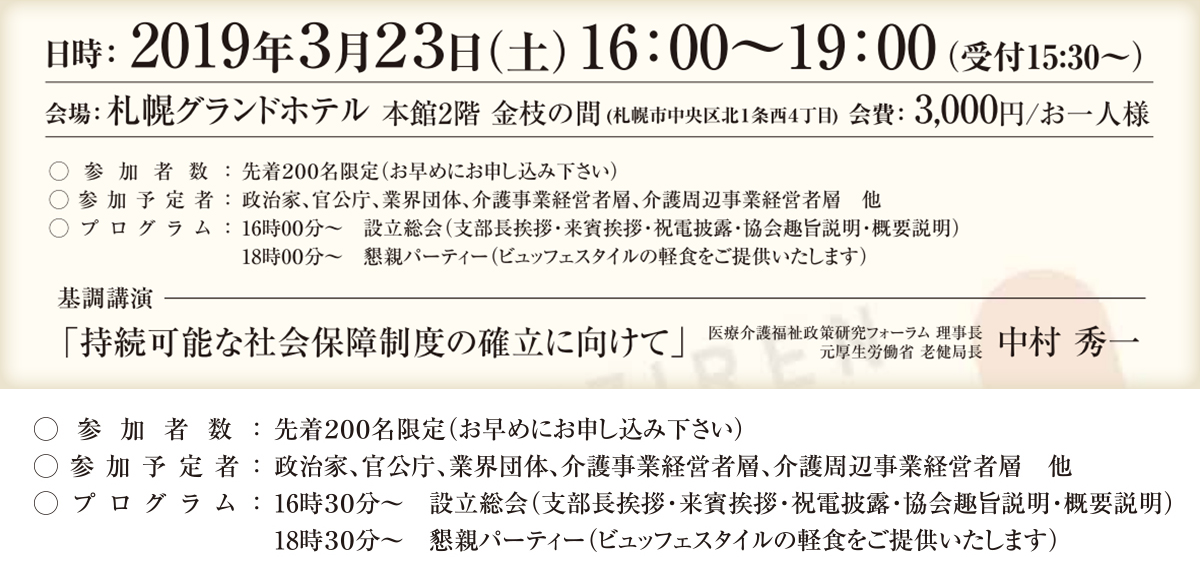 3月23日(土)に、ヒューマンリンク代表取締役の田中紀雄も副支部長に就任している、全国介護事業者連盟 北海道支部の設立総会を開催いたします。先着200名限定となっておりますので、お早めにお申し込みください。