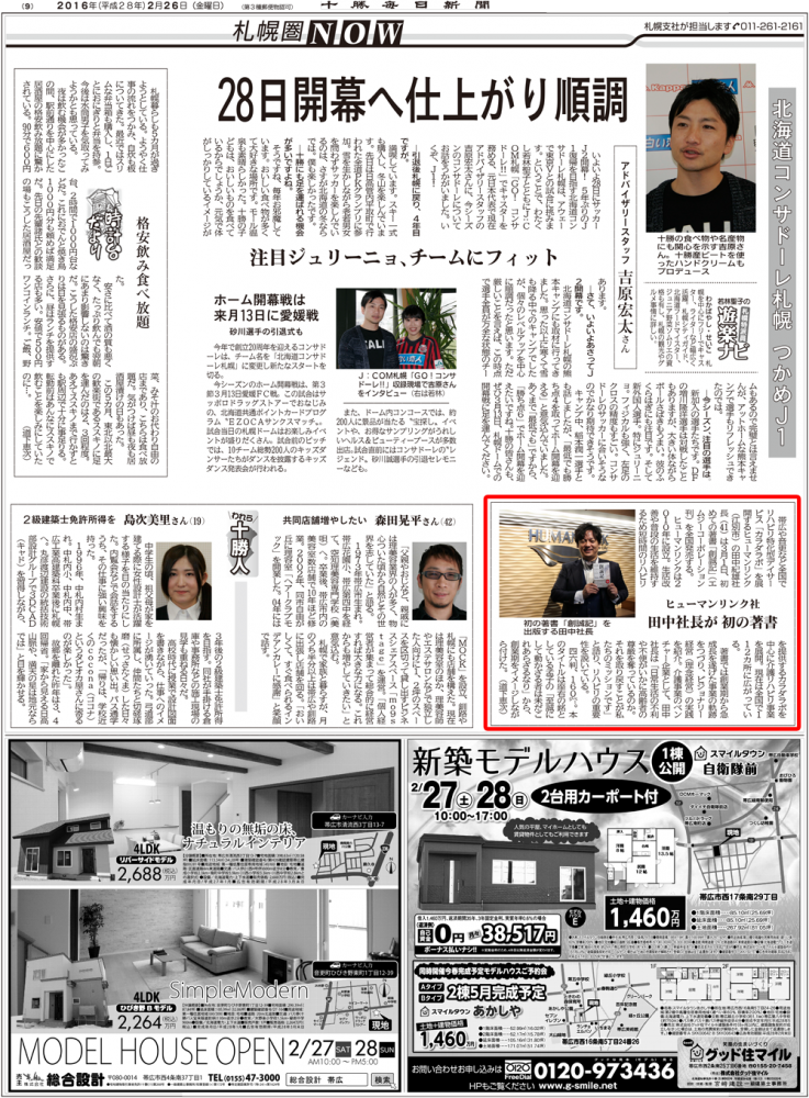 「創誠記」が十勝毎日新聞2月26日号に掲載されました。