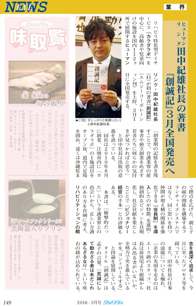 月刊クオリティ 3月号に弊社代表取締役 田中紀雄 著「創誠記~介護リハビリテーションの確立」が掲載されました。