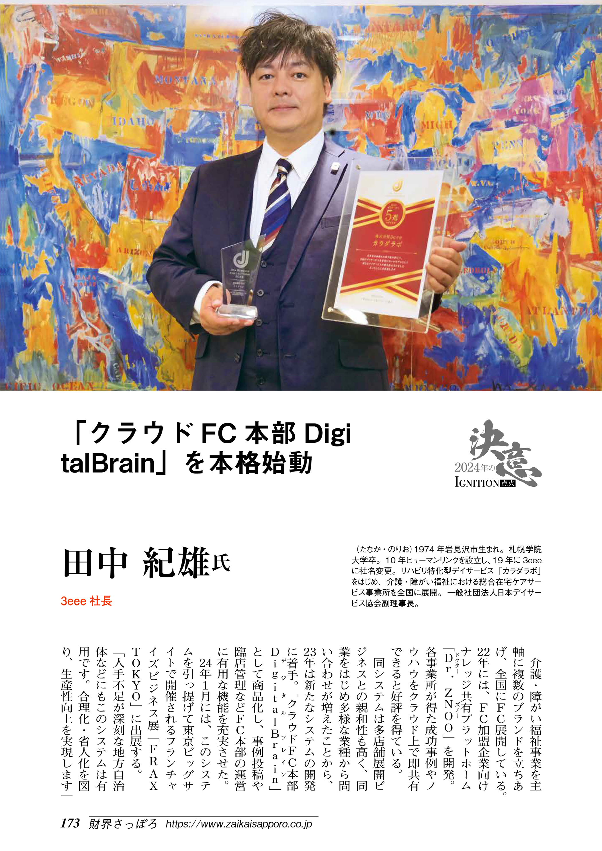 『財界さっぽろ』2024年新年特大号の173ページに、弊社代表取締役・田中 紀雄のインタビューをご掲載いただきました。