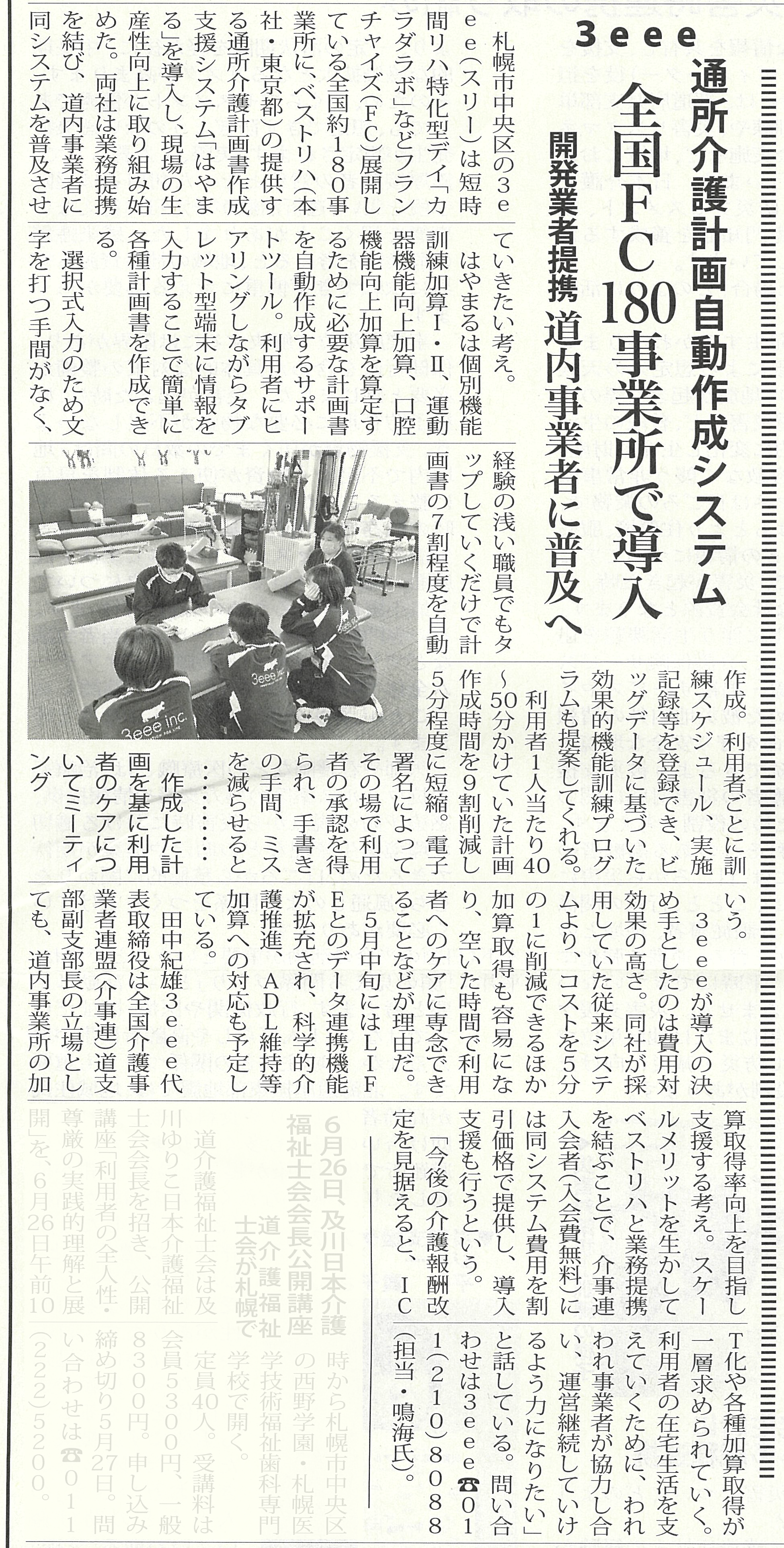 介護新聞 第1080号の第10面に、先日プレスリリースをいたしました”介護現場の生産性向上実現に向けたベストリハ株式会社と業務提携”について、ご掲載頂きました。