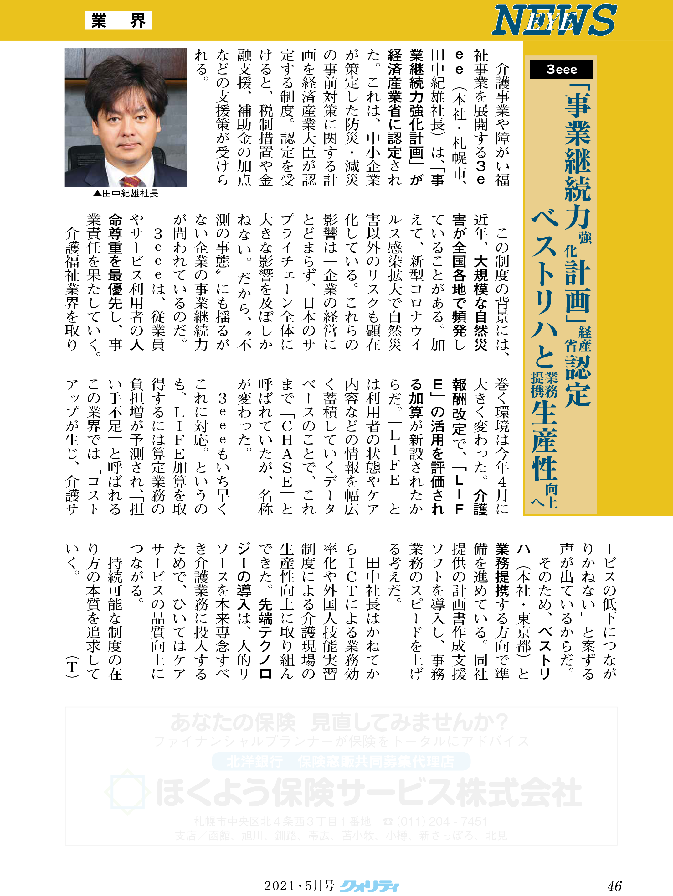 月刊クォリティ5月号の46ページに、弊社の事業継続力強化計画の認定、ベストリハ株式会社との業務提携についてご掲載頂きました。