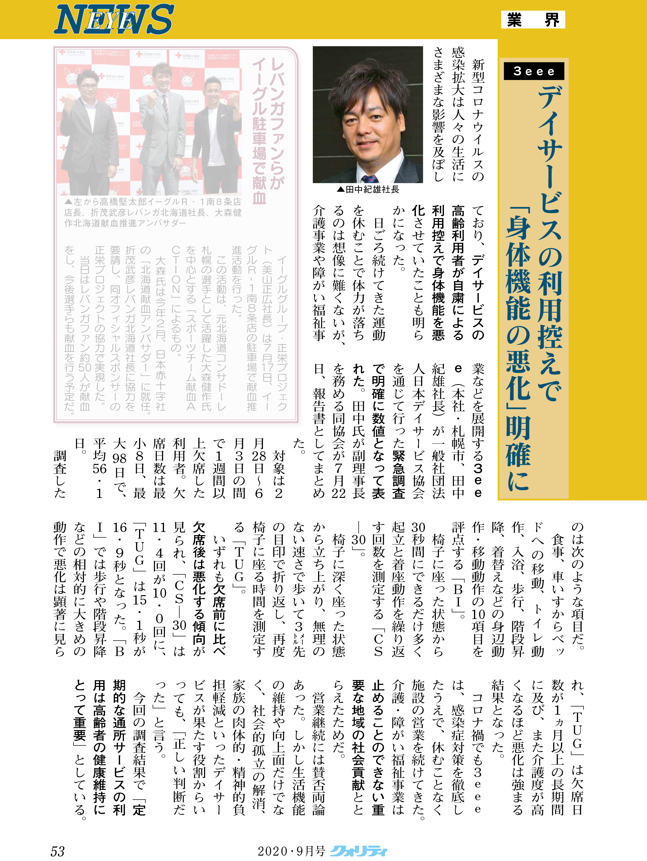 月刊クォリティ9月号の53ページに、先日プレスリリースをいたしました”コロナ禍自粛による長期的な通所控えが与える影響についての緊急調査”について、掲載頂きました。