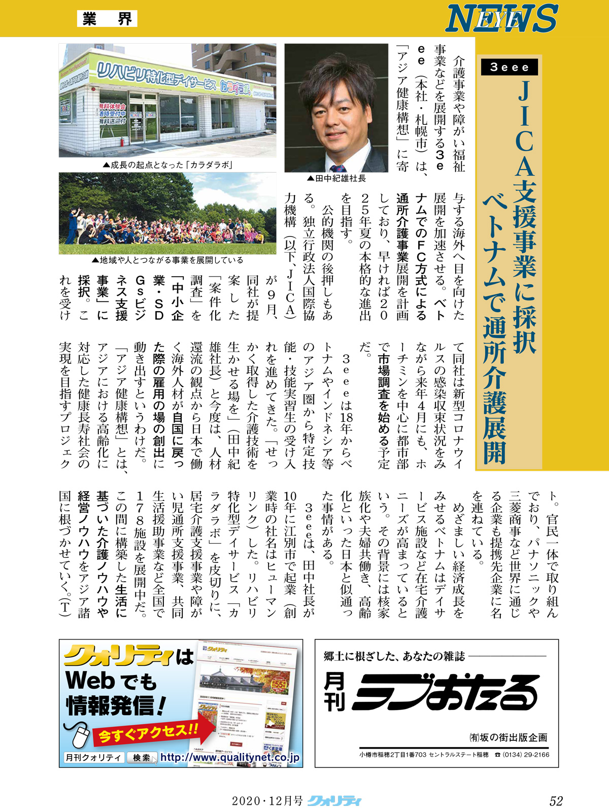 月刊クオリティ12月号の52ページに、JICA「中小企業・SDGs ビジネス支援事業」案件化調査採択についてご掲載頂きました。