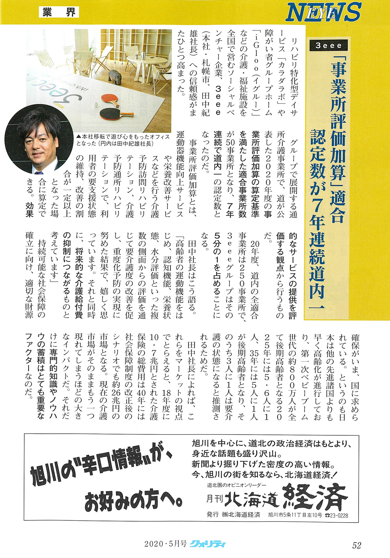 月刊クオリティ5月号に、令和2年度における事業所評価加算の適合事業所数が7年連続で道内No.1となったことについてご掲載いただきました。