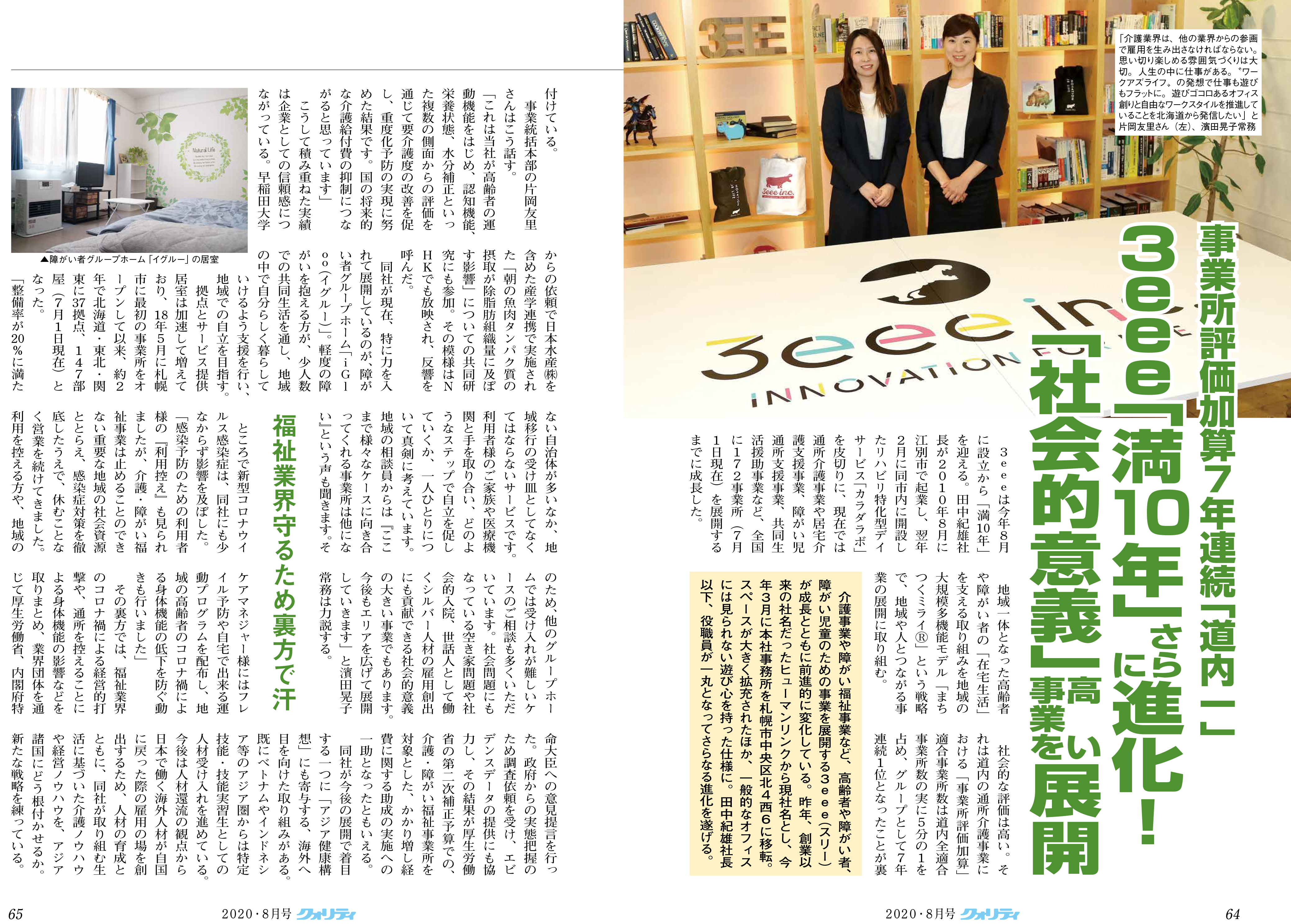 月刊クオリティ8月号に、早稲田大学との共同研究や障がい者グループホームイグルーについて、事業所評価加算算定7年連続No.1など、当社の取り組みを中心にご掲載いただきました。