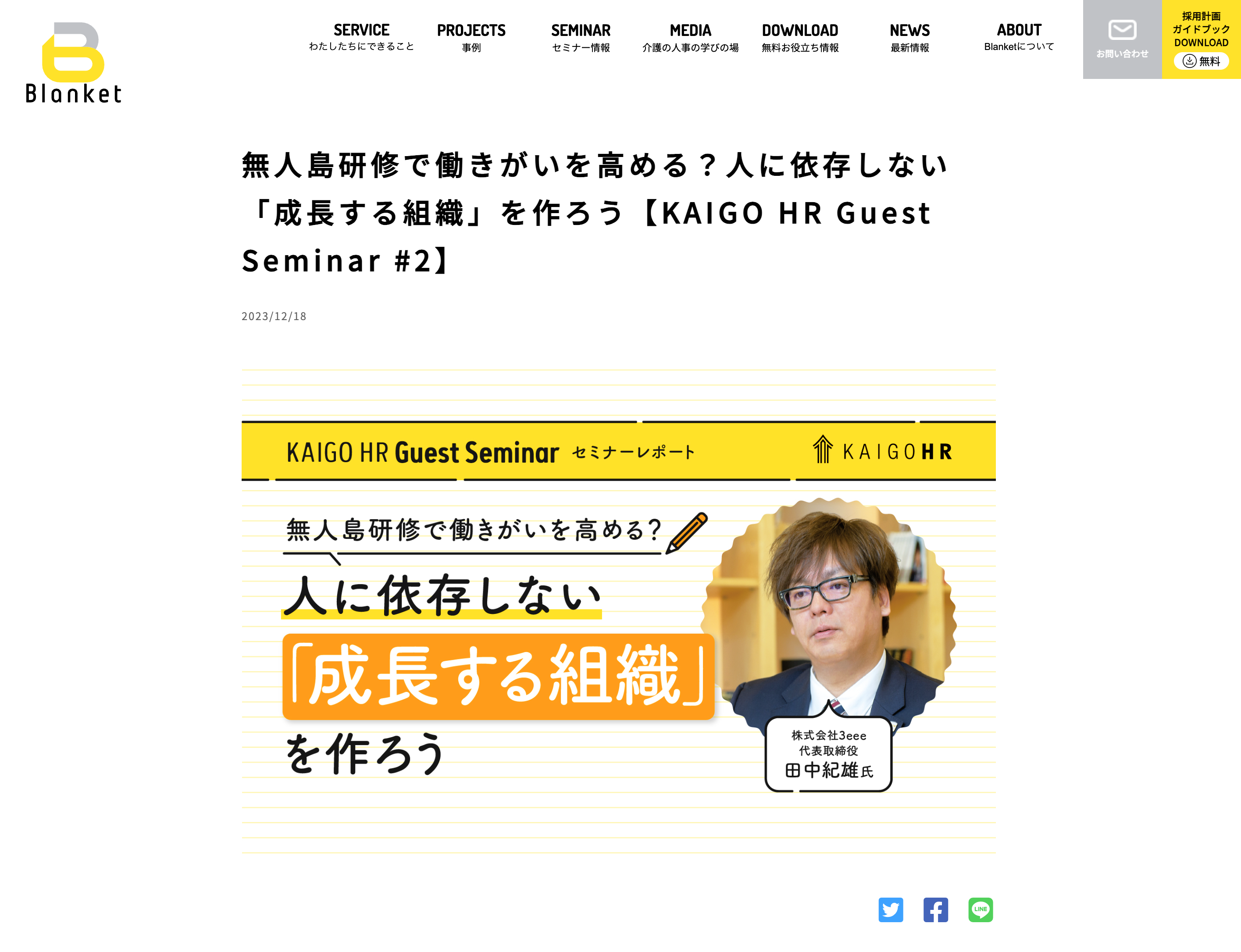 株式会社Blanket ウェブサイトに、弊社代表取締役・田中 紀雄が登壇した『KAIGO HR ゲストセミナー』でのセミナー内容を要約した記事をご掲載いただきました。