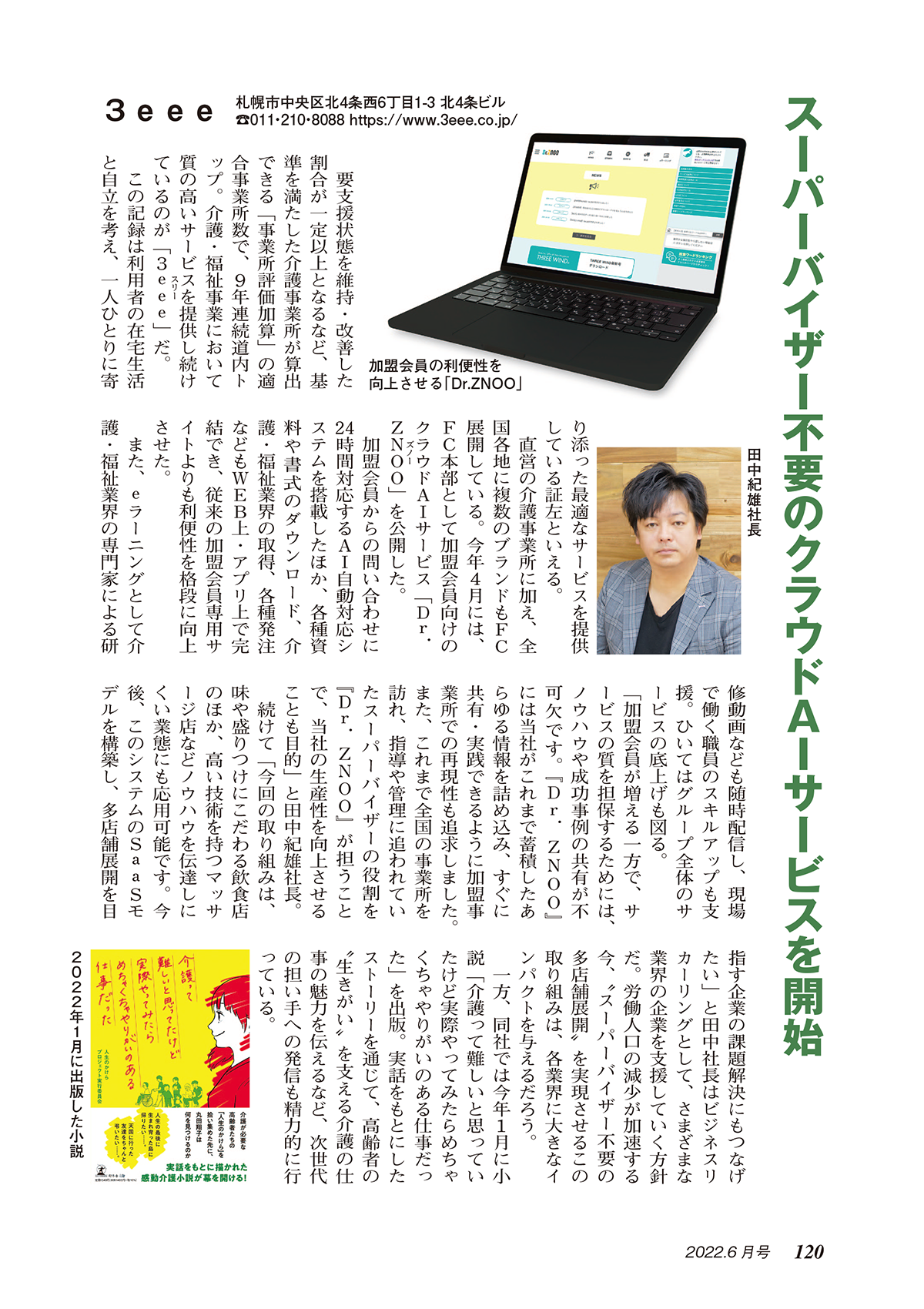 財界さっぽろ2022年6月号の120ページに、事業所評価加算算定9年連続No.1、弊社開発のクラウドAIサービス『Dr.ZNOO(ドクター・ズノー)』、小説「介護って難しいと思っていたけど実際やってみたらめちゃくちゃやりがいのある仕事だった」についてご掲載頂きました。