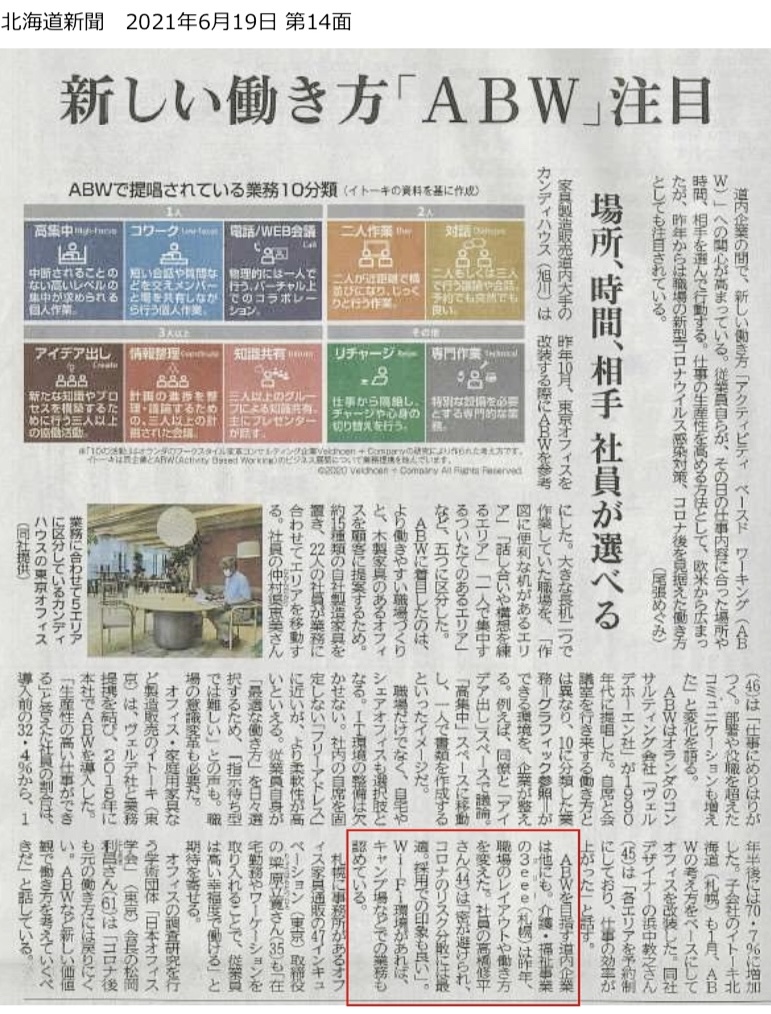 北海道新聞社よりABWという働き方について取材を受け、6月19日発行の北海道新聞の第14面に取組内容をご掲載頂きました。