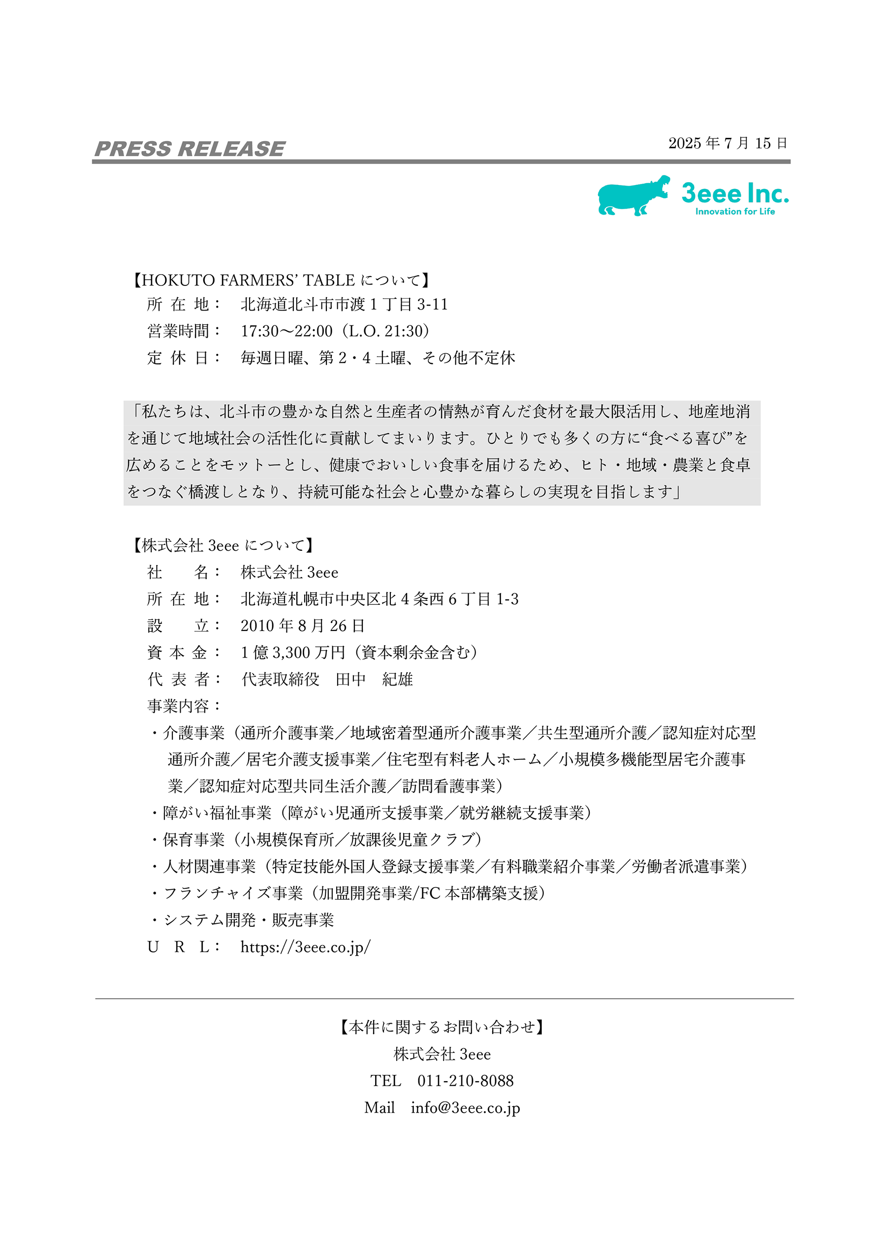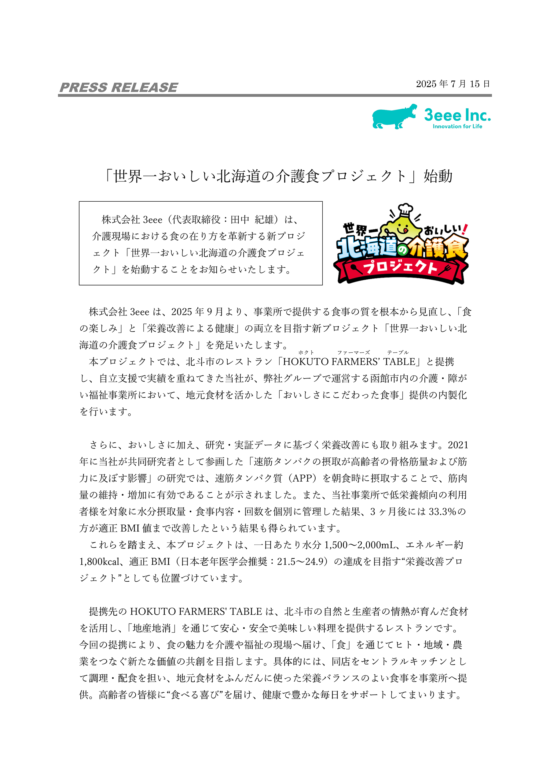 株式会社3eee(代表取締役:⽥中 紀雄)は、 介護現場における⾷の在り⽅を⾰新する新プロジェクト 「世界⼀おいしい北海道の介護⾷プロジェクト」を 始動することをお知らせいたします。