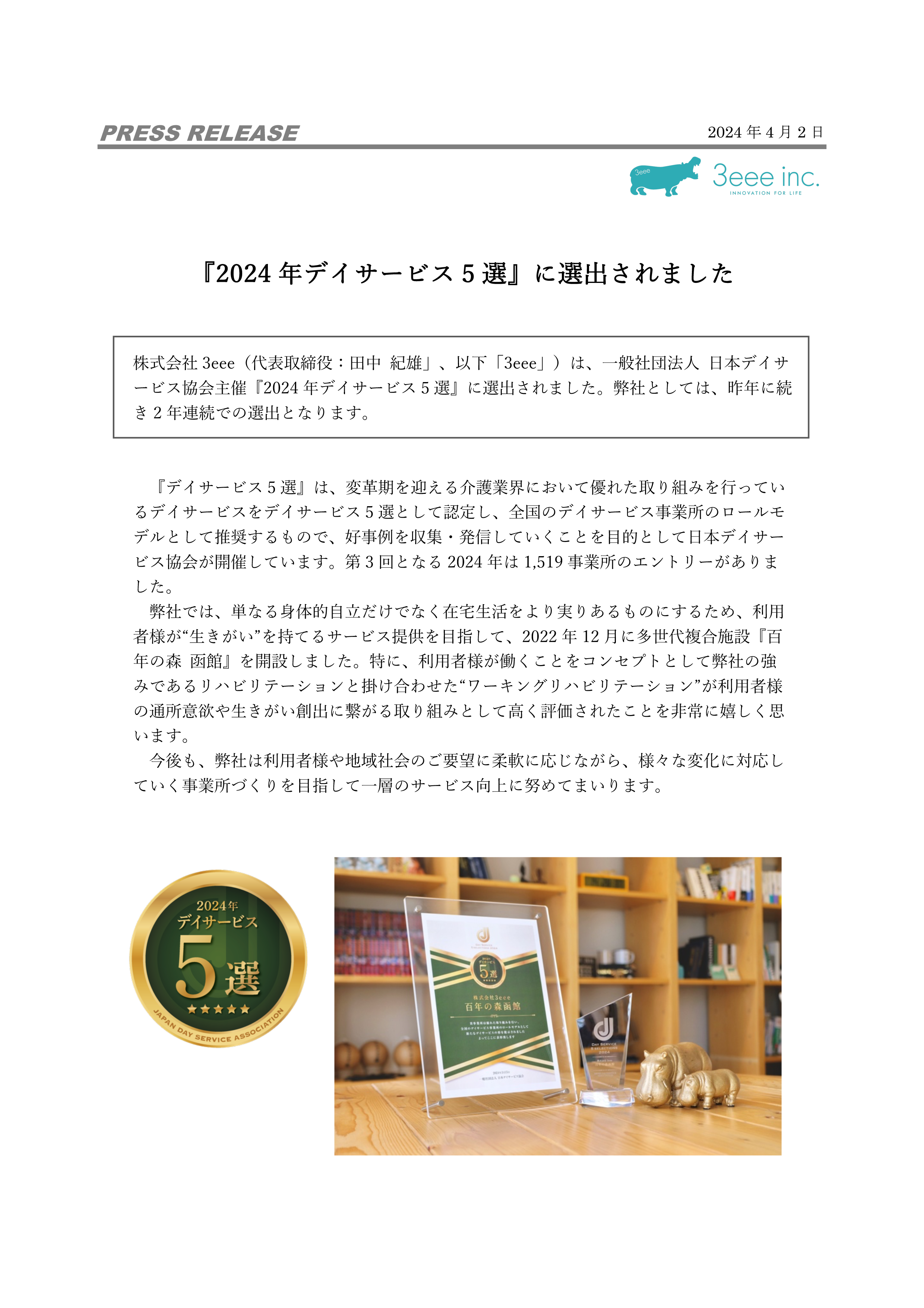 『2024年デイサービス5選』に選出されました。