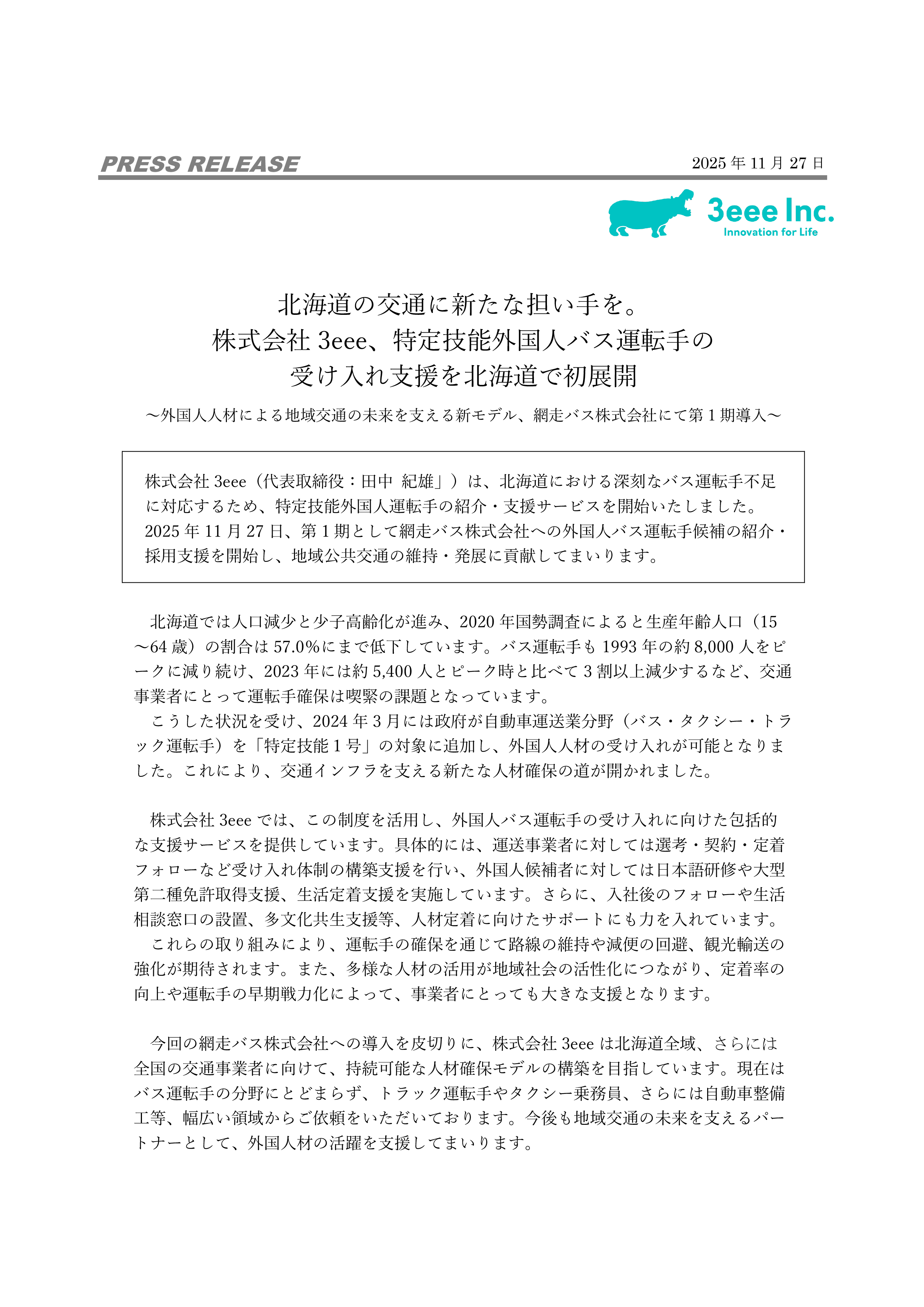 株式会社3eee(代表取締役:⽥中 紀雄」)は、北海道における深刻なバス運転⼿不⾜に対応するため、特定技能外国⼈運転⼿の紹介・⽀援サービスを開始いたしました。 2025年11⽉27⽇、第1期として網⾛バス株式会社への外国⼈バス運転⼿候補の紹介・採⽤⽀援を開始し、地域公共交通の維持・発展に貢献してまいります。