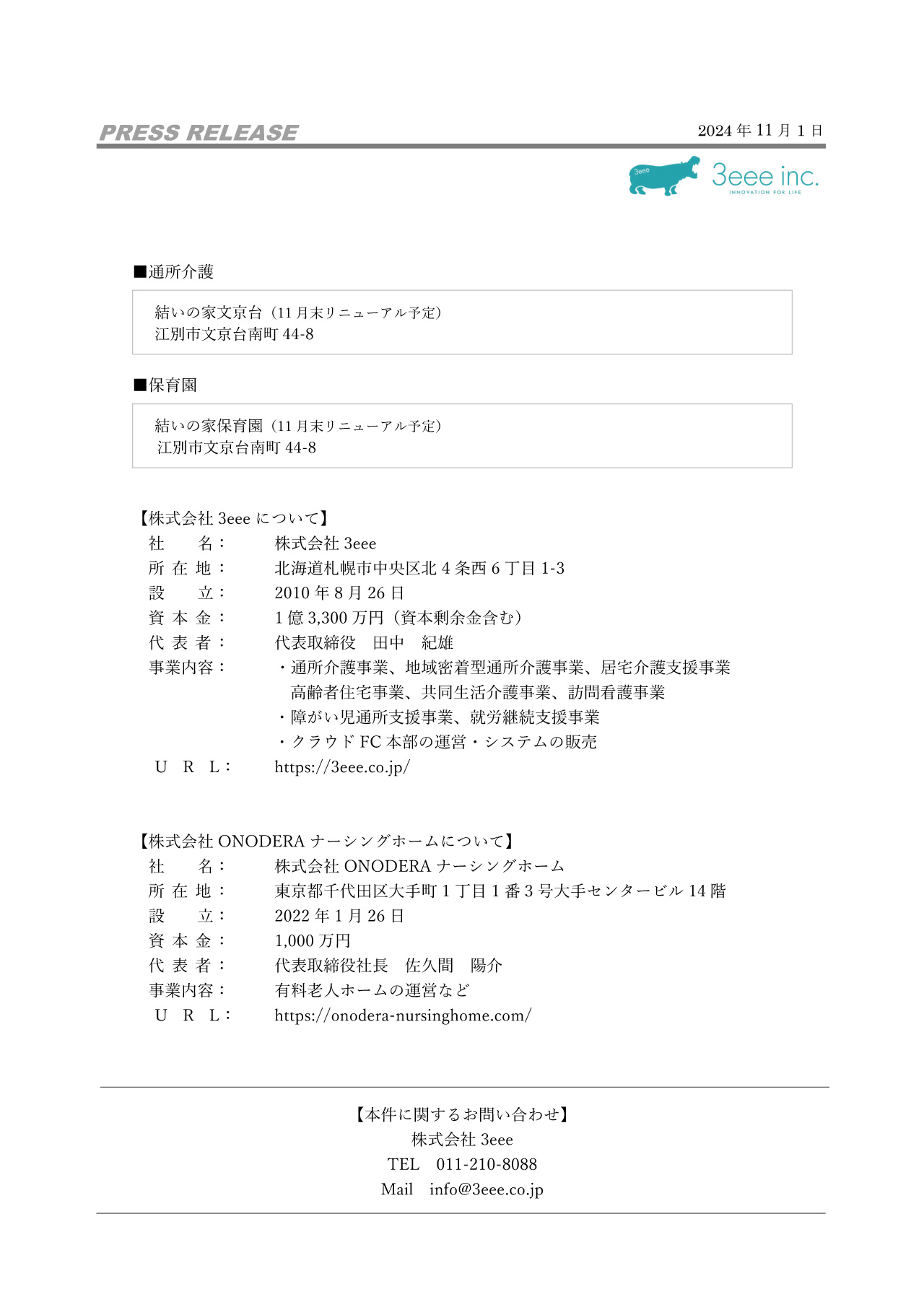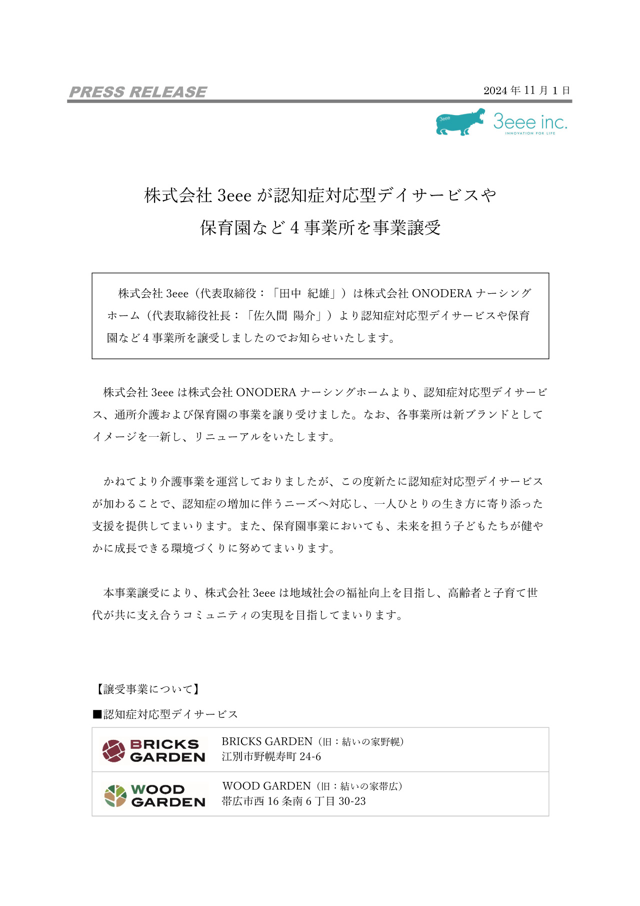 株式会社3eee(代表取締役:「田中 紀雄」)は株式会社ONODERAナーシングホーム(代表取締役社長:「佐久間 陽介」)より認知症対応型デイサービスや保育園など4事業所を譲受しましたのでお知らせいたします。