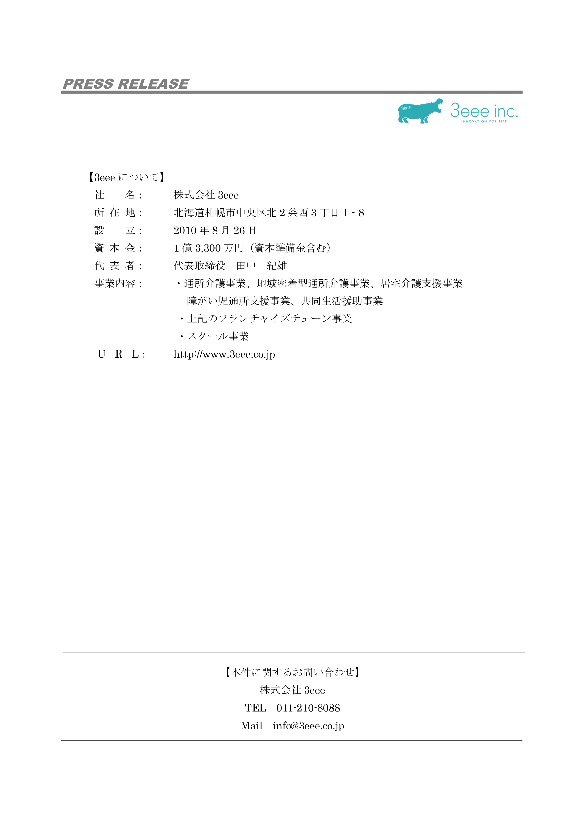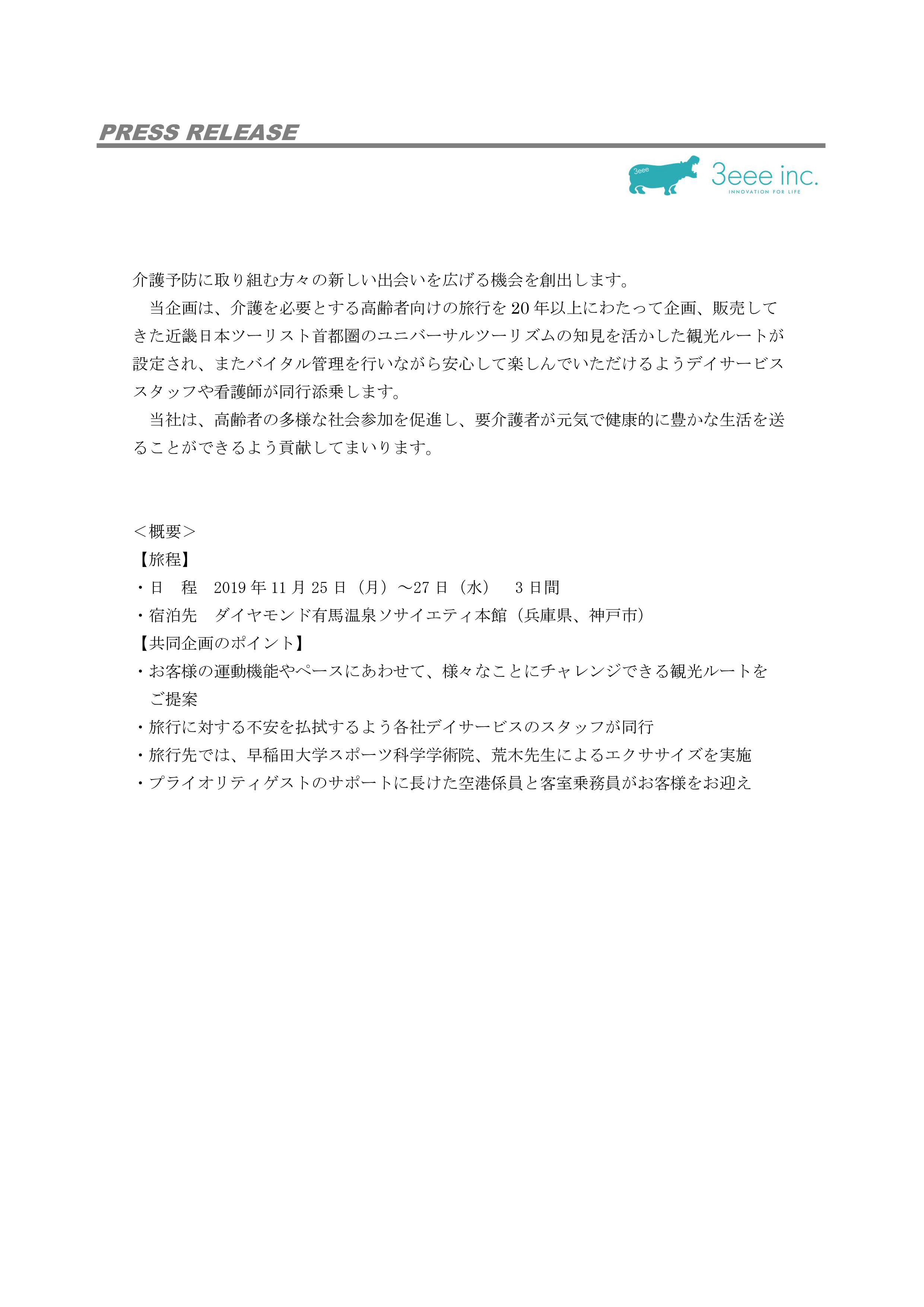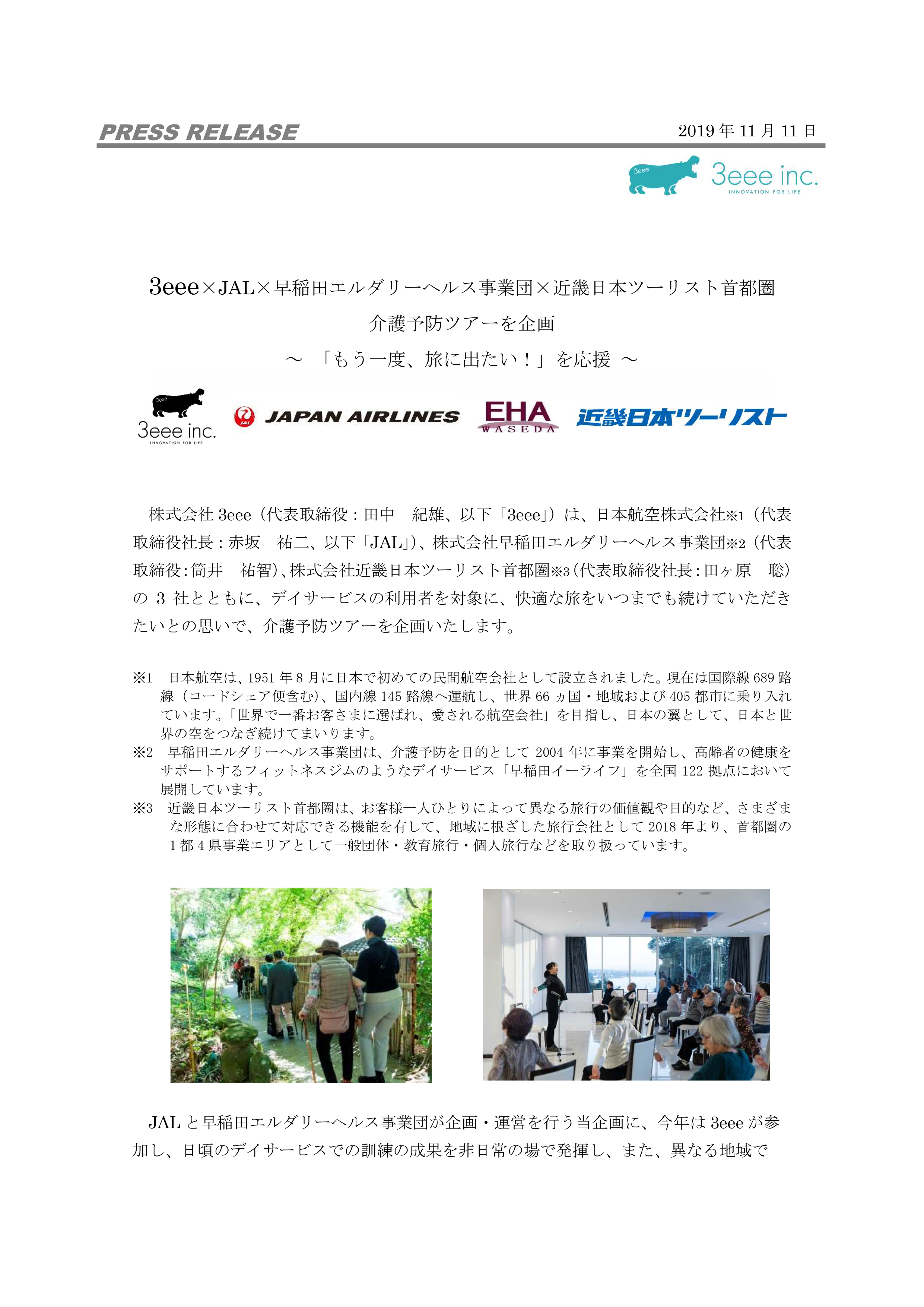 株式会社3eee(代表取締役:田中 紀雄、以下「3eee」)は、日本航空株式会社(代表取締役社長:赤坂 祐二、以下「JAL」)、株式会社早稲田エルダリーヘルス事業団(代表取締役:筒井 祐智)、株式会社近畿日本ツーリスト首都圏(代表取締役社長:田ヶ原 聡)の3社とともに、デイサービスの利用者を対象に、快適な旅をいつまでも続けていただきたいとの思いで、介護予防ツアーを企画いたします。
